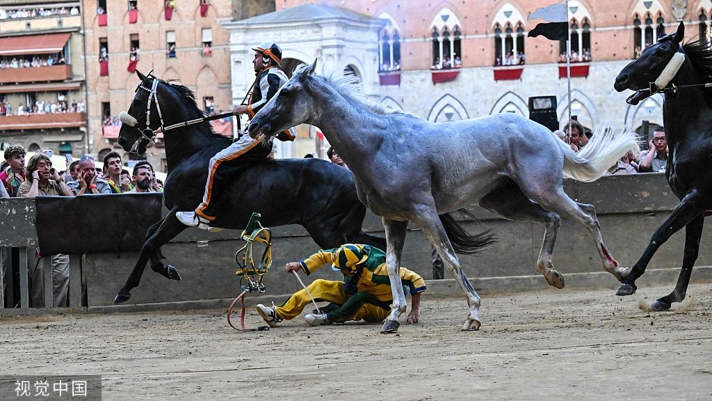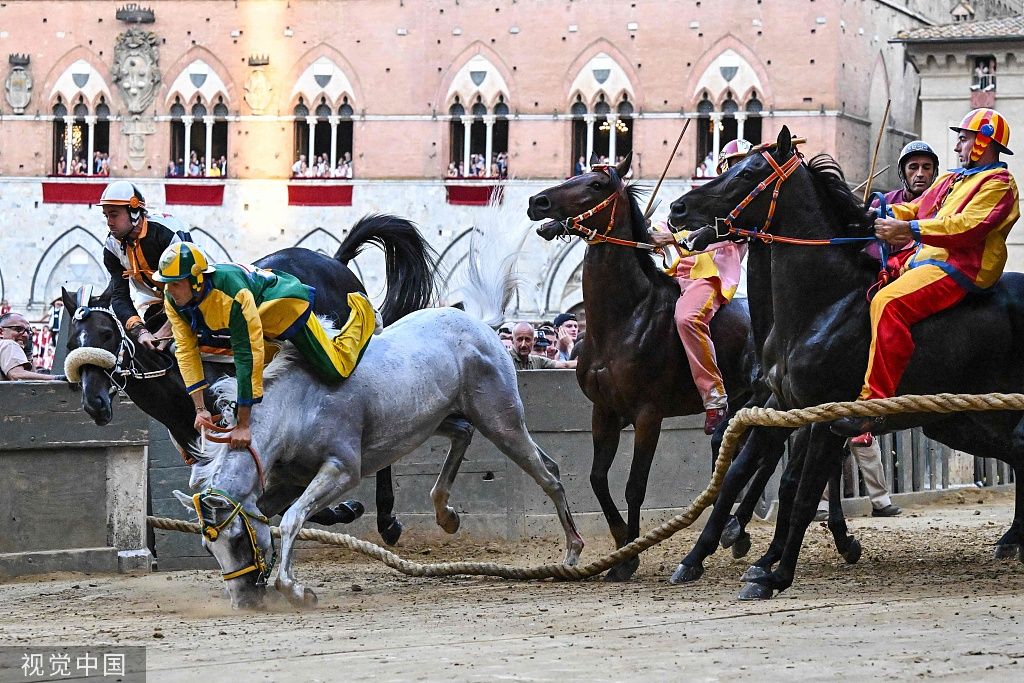 当地时间2022年7月2日,意大利托斯卡纳,当地举行锡耶纳赛马节,代表“布鲁科”地区参赛的意大利骑师Stefano Piras和他的马(右)在抢跑中摔倒。