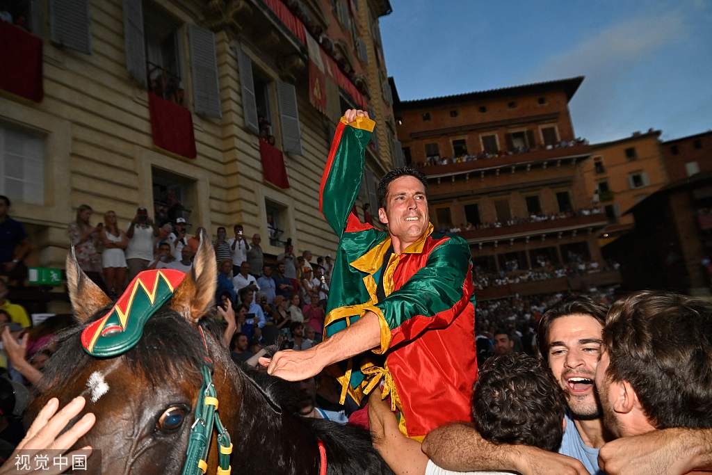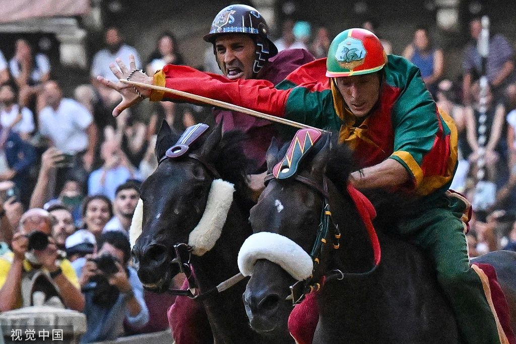 当地时间2022年7月2日,意大利托斯卡纳,当地举行锡耶纳赛马节,代表不同地区参赛的意大利骑师骑马抵达终点。