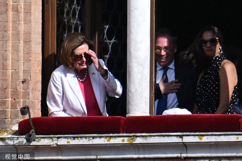 当地时间2022年7月2日,意大利托斯卡纳,在历史悠久的锡耶纳赛马节开始之前,美国众议院议长南希·佩洛西(左)站在窗口俯瞰卡博广场。