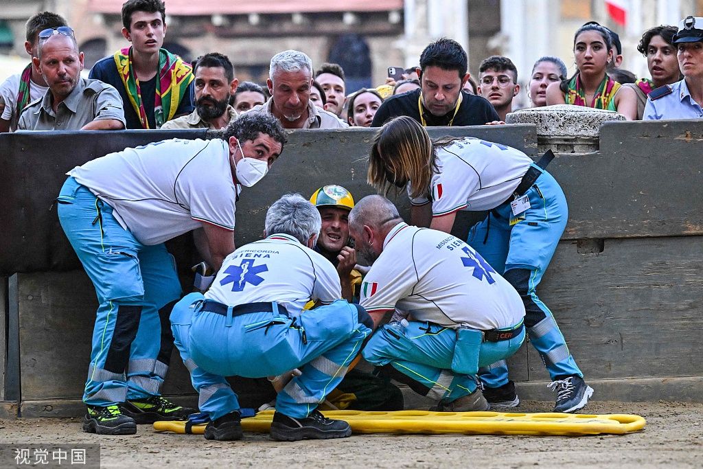 当地时间2022年7月2日,意大利托斯卡纳,当地举行锡耶纳赛马节,代表“布鲁科”地区参赛的意大利骑师Stefano Piras和他的马在抢跑中摔倒。