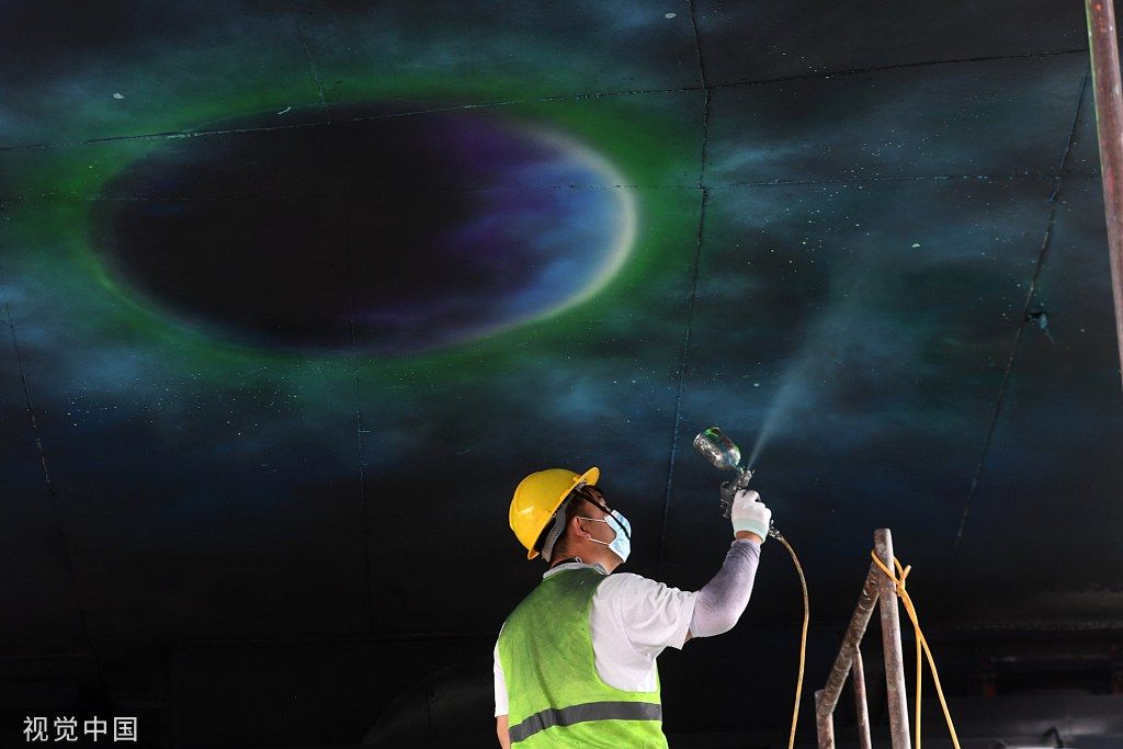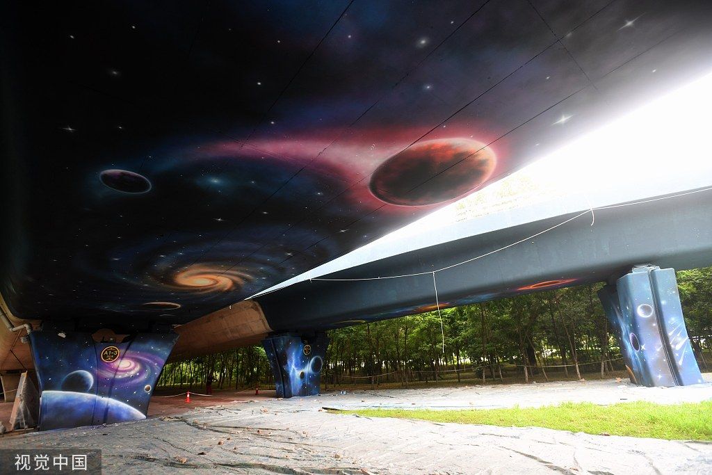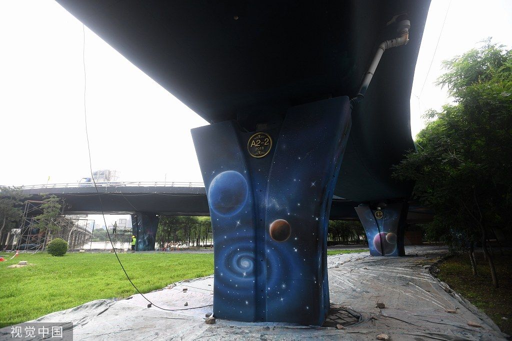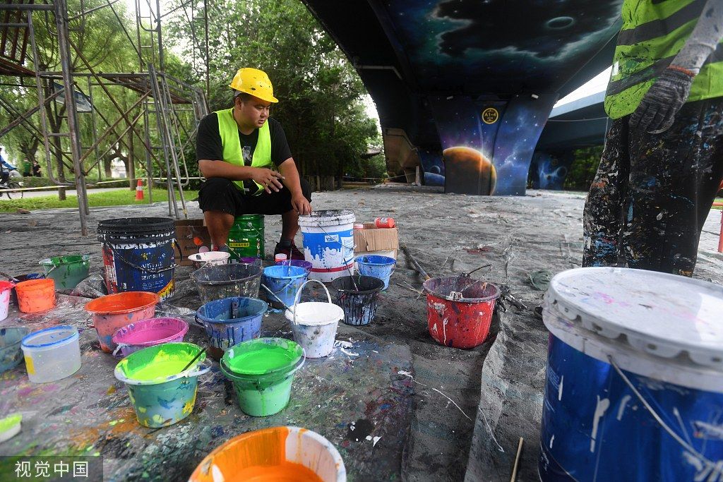 2022年7月4日,沈阳,在胜利桥桥下,画师们精绘细喷的忙碌着,一个个太空壮美的景象呈现在桥体之上。