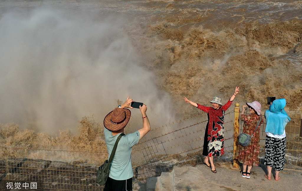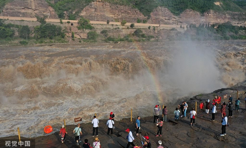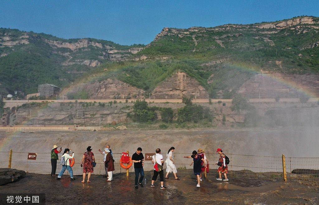 2022年7月4日,山西临汾,游客在吉县黄河壶口瀑布景区游览观瀑。