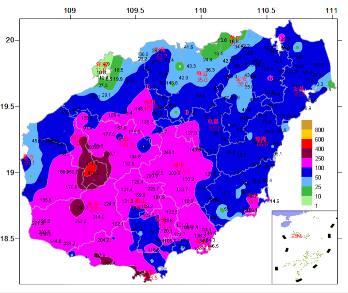 ▲2022年7月1日08时~2日08时海南全岛雨量 (单位:毫米;图中红色数字为城区测站雨量,黑色数字为乡镇自动站雨量)