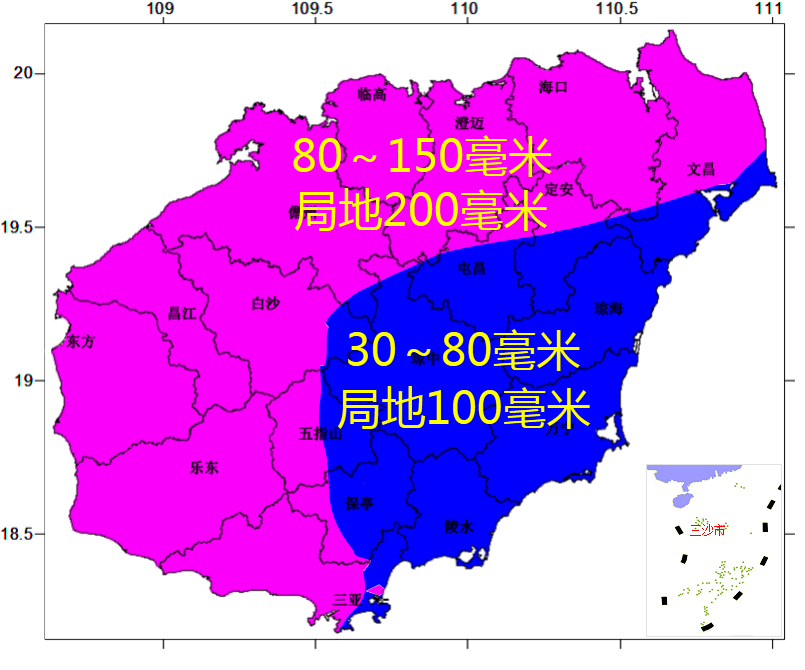 预计,7月2日08时~4日08时各地累积雨量:海口、定安、澄迈、文昌、临高、儋州、白沙、昌江、东方、乐东和三亚等市县80~150毫米、局地200毫米;其余市县30~80毫米、局地100毫米。