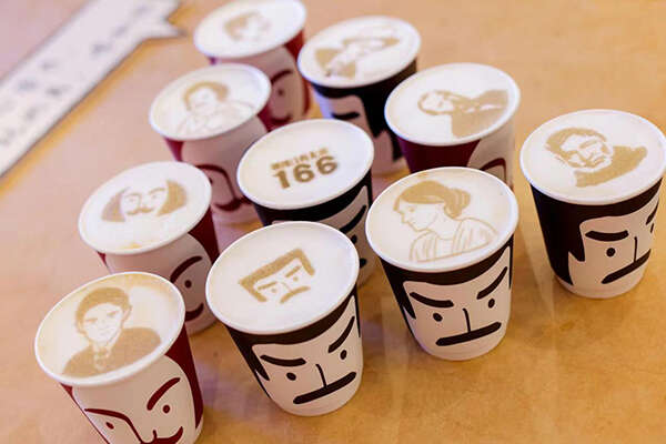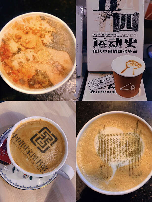 如上文提及的,国博一下就推出了十三种花色的咖啡拉花,且设计都来自馆藏文物,国家图书馆也将logo印在咖啡上,“朝花夕拾”设计了中外文学知名作者头像的拉花。在咖啡上作画难度不是很大,而且可以根据各种活动的节点进行设计,比如国家大剧院就曾为了配合展览推出慕夏咖啡拉花,内山书店也配合五四运动推出“振臂一呼”形状的咖啡拉花。