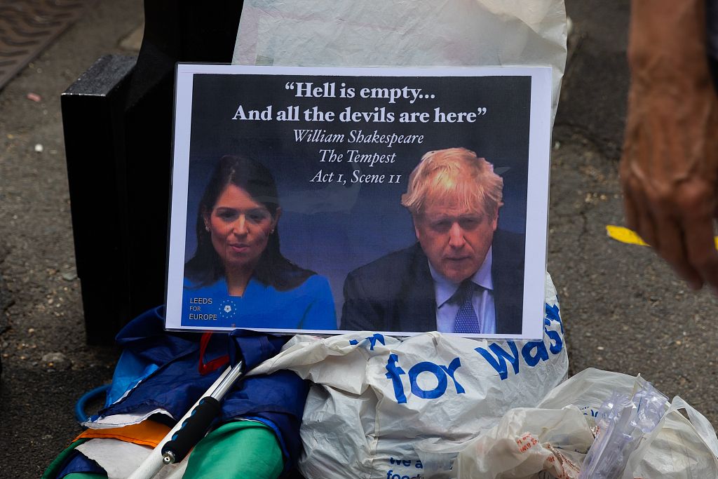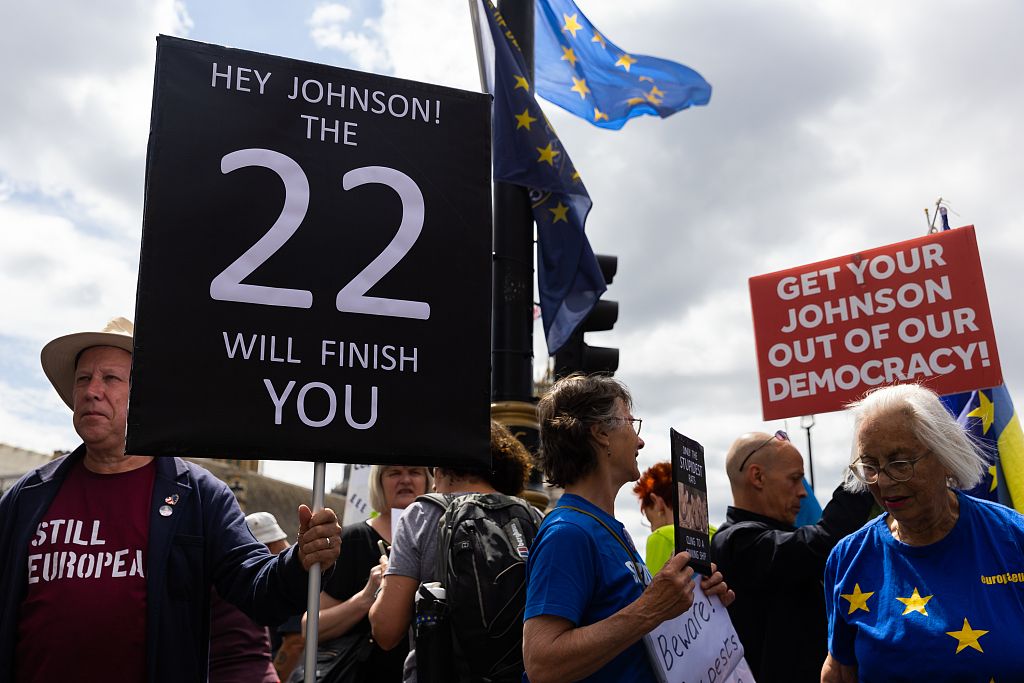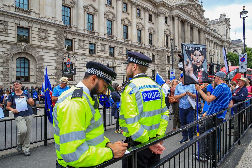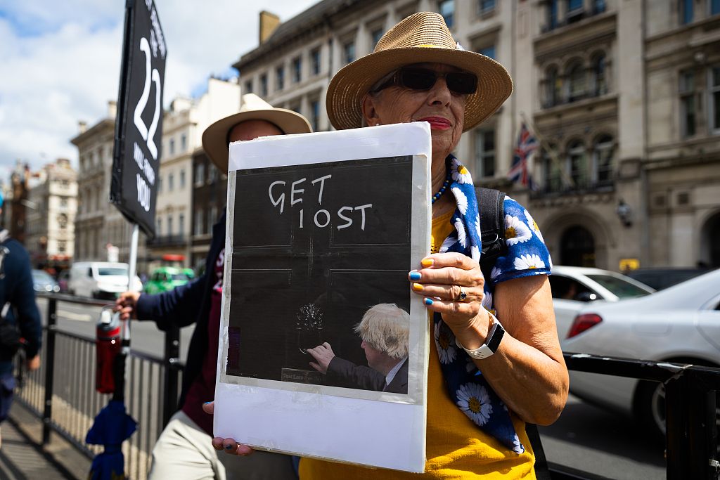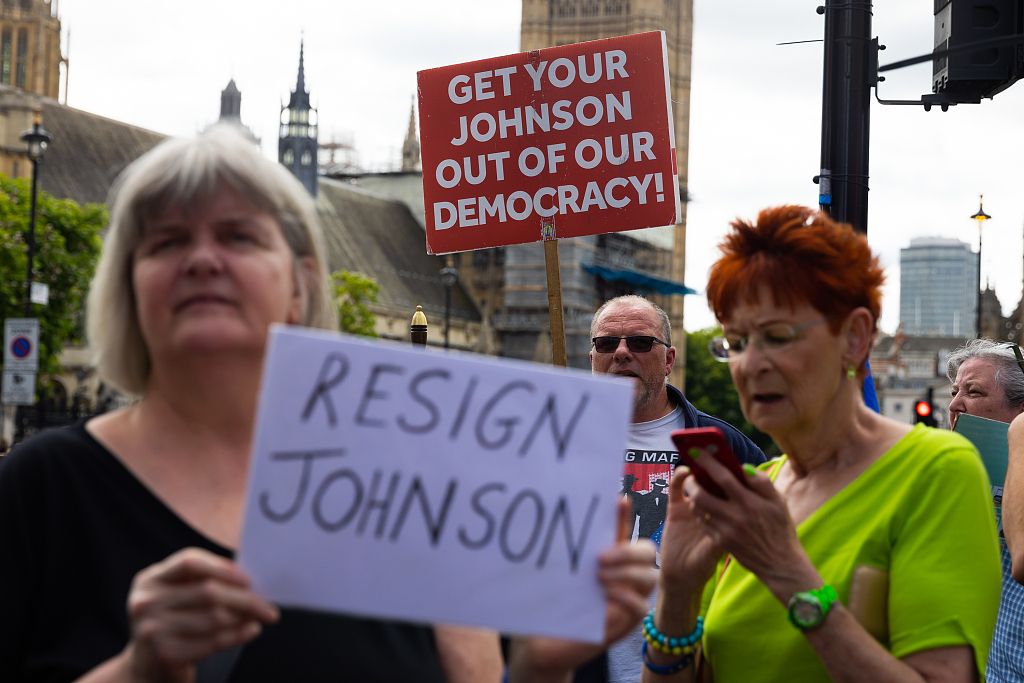 当地时间2022年7月6日,英国伦敦,反保守党抗议者在议会大厦外示威。鲍里斯·约翰逊警告保守党议员,他打算继续留任。在大臣们纷纷辞职之际,他所在党内的策划者正聚集在一起,讨论可能举行的新一轮信任投票。