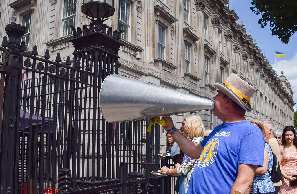 当地时间2022年7月6日,英国伦敦,在唐宁街外的示威活动中,反脱欧活动家Steve Bray通过老式的扩音器喊口号。随着多名大臣从保守党政府辞职,反对鲍里斯·约翰逊的抗议者聚集在威斯敏斯特,迫使鲍里斯·约翰逊辞职的压力越来越大。