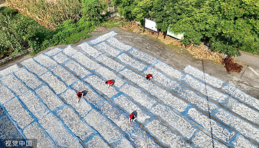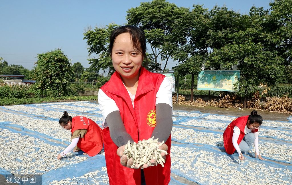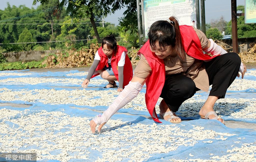 2022年7月7日,四川眉山,仁寿县钟祥镇碾米村,养蚕户正在晾晒僵蚕。