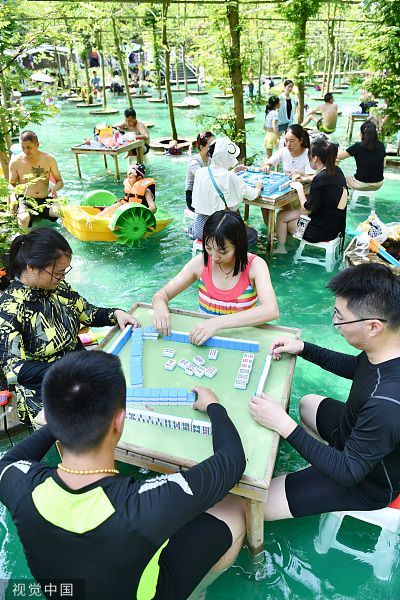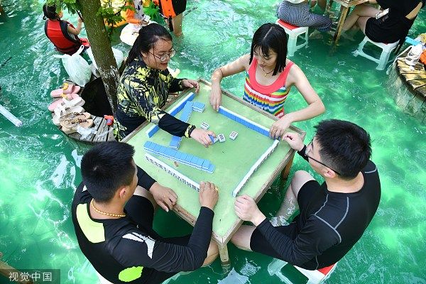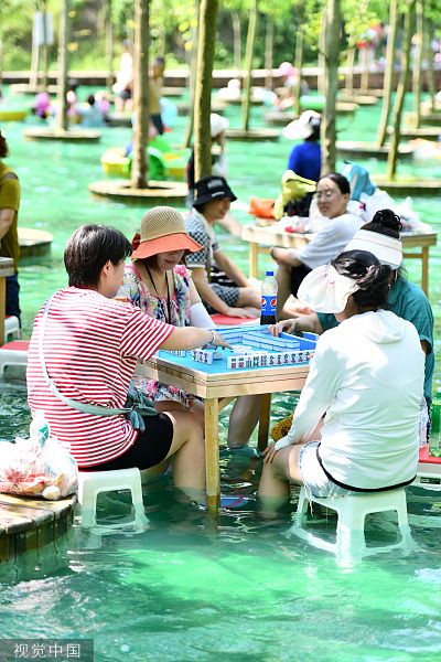 2022年7月9日,成都一景区内,市民打“水上麻将”,享受夏日清凉。