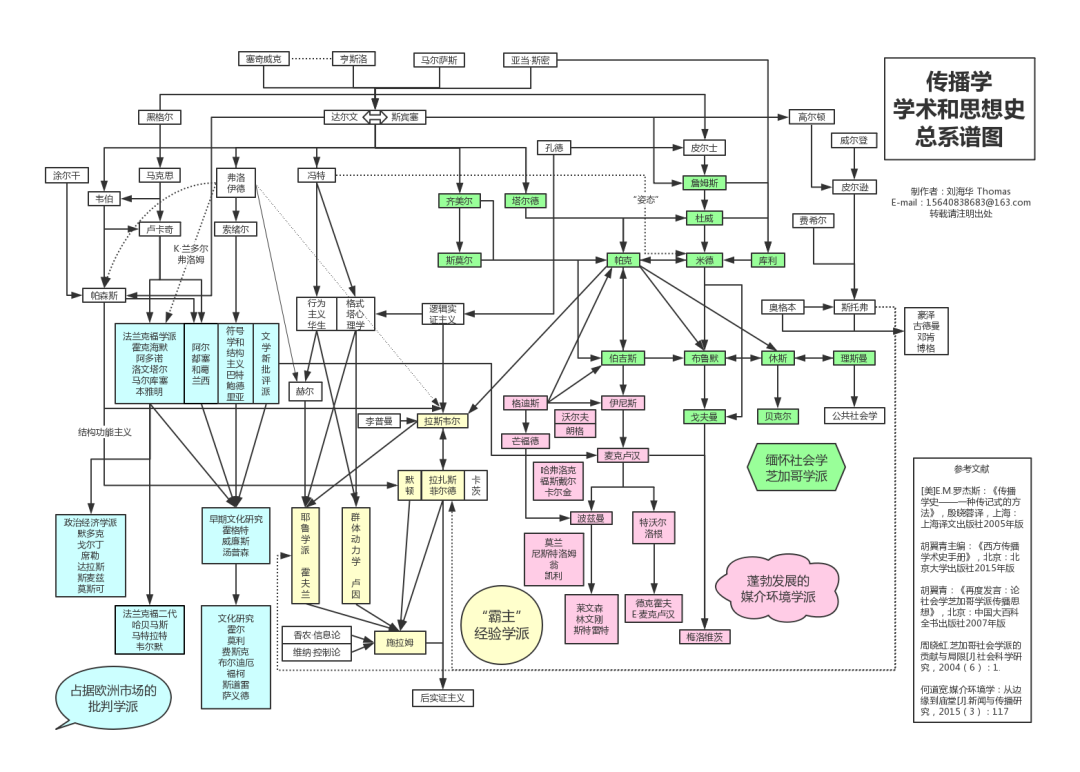 对于刘海华来说,对科研的兴趣是在工作中萌发,在求知好奇中成长。备战考研时,传播学这一涉及社会学、政治学、心理学、人类学等多领域的交叉学科,其思想学术发展脉络激发起他浓厚的求知欲。入学前的暑假,他废寝忘食、孜孜不倦地读书,参考前人研究绘制出一张爱不释手的传播学学术与思想史系谱图。