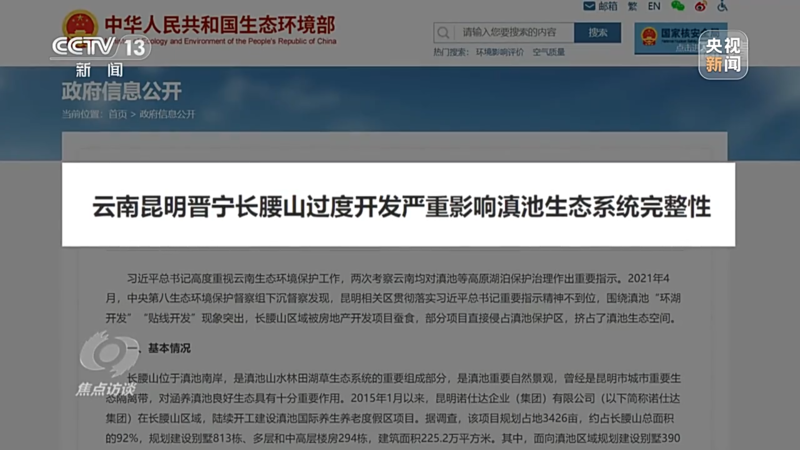 2021年5月6日,中央第八生态环境保护督察组曝光了“云南昆明晋宁长腰山过度开发严重影响滇池生态系统完整性”典型案例。督察组指出,昆明市围绕滇池“环湖造城”“贴线开发”,环滇池湖滨带特别是环草海湖滨带大量被房地产等项目侵占。其中在滇池二级保护区已建成和在建别墅200多栋。长腰山90%以上区域被钢筋混凝土替代,长腰山变成“水泥山”,基本丧失生态功能。