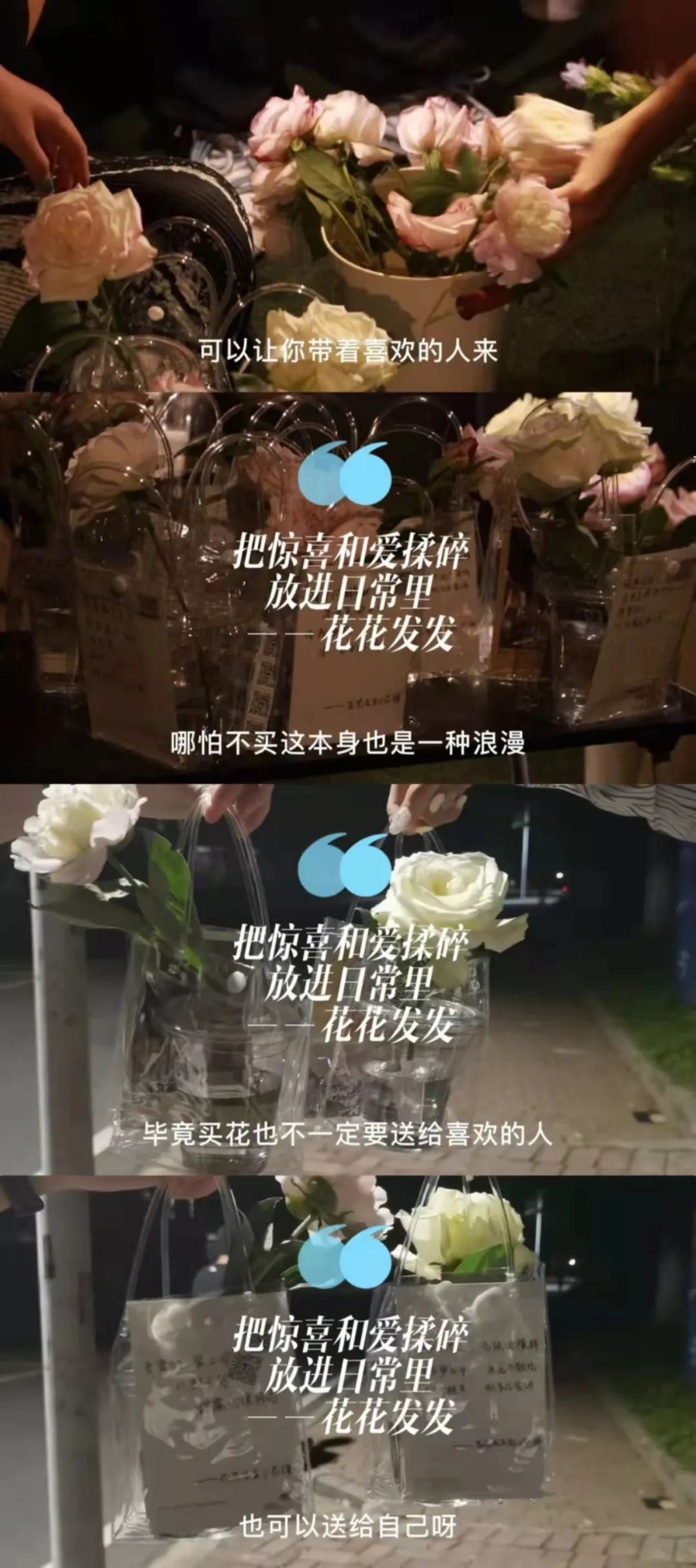 @花花发发店主:我是和朋友商量一起开花店的,希望能在大学期间做一些有意义的事情。双休日晚上,大家愿意在操场闲逛,我们就会在操场上摆摊,给来来往往的人送去温暖与盎然。买花不一定要送给别人,也能送给自己呀!
