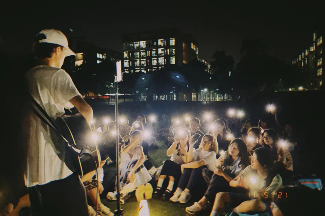 疫情将学生囿于高墙,于是有人选择在校园里开草地音乐会,用一把吉他撩动夜的心弦,用一段旋律谱写青春年华。