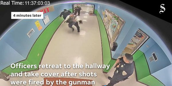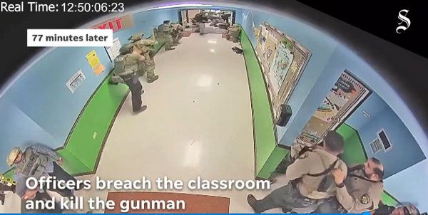 视频显示,在1名18岁的枪手进入教学楼的3分钟后,第一批警方已到达现场。但在枪手朝警察开了一枪后,警方立刻撤退躲避。尽管枪手在教室内持续开枪,但直到45分钟后才有警察靠近教室,但并没有试图破门。