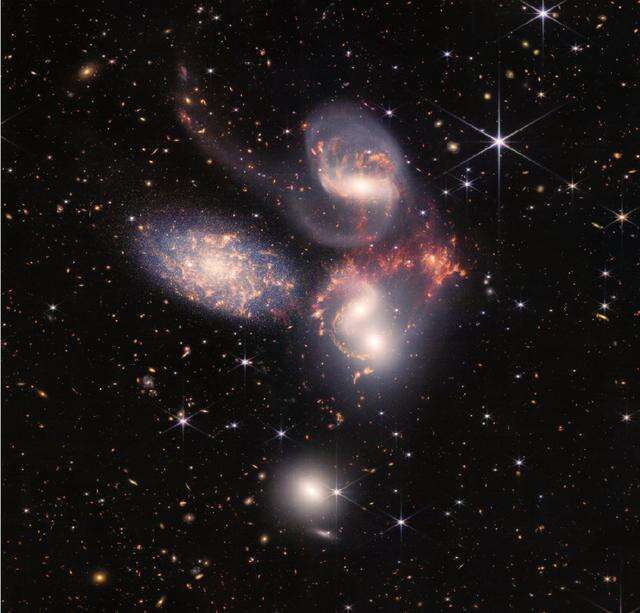 史蒂芬五重星系是一个包含4个星系组成的星系群,距离地球约3亿光年。照片中还包含着银河系内恒星,更小星点是在上百亿光年外的星系
