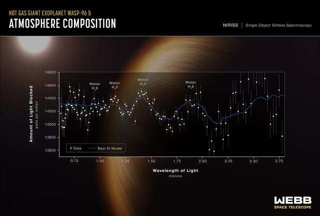 WASP-96b是距离地球大约1150光年的一颗气态巨行星,质量大约为木星的一半,公转周期只有3.4天,于2014年被发现。韦布观察到它的部分分子光谱,有的有散射现象,这意味着可能行星上有霾的现象