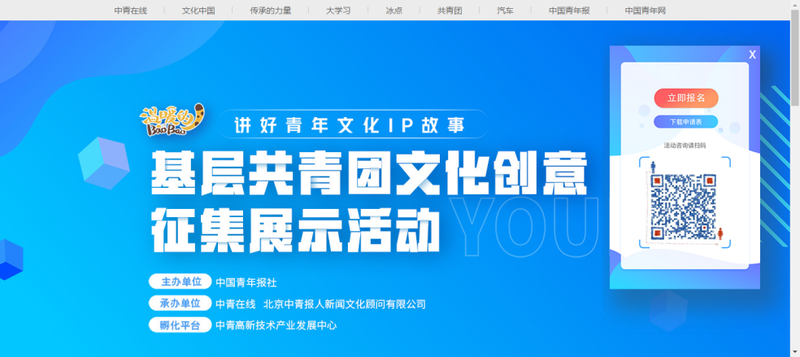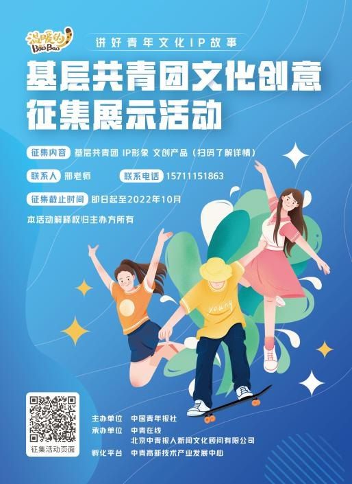 中国青年报社开展的“温暖的BaoBao 讲好青年文化IP故事”基层共青团文化创意征集展示活动正在火热进行中。活动以征集展示“基层共青团、IP形象、文创产品”等相关内容,来展示汇聚基层组织的创新创意。蕴含地方非物质文化遗产、地域特色民俗文化,对文化育人、服务带动青年有一定促进作用的文化创意作品均可投稿。