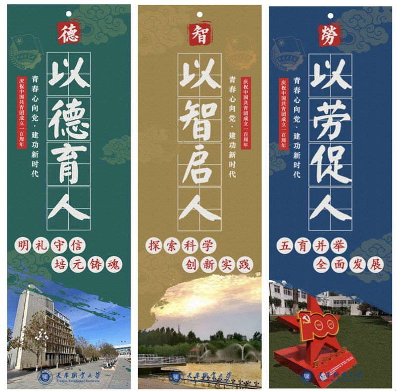 《凝心聚力,全面发展》系列作品通过五幅不同的颜色,以引人注目的大字为标题,结合庆祝中国共青团建团百年、校园风景、团徽等元素,从德育、智育、体育、美育、劳育五大方面体现出德智体美劳全面发展是党和国家对大学生培育定位的基本准则,也是人类教育的趋向目标;传递出积极乐观的心态,倡导大学生奋发向上的态度,充分体现出基层共青团培育德智体美劳全面发展的高素质技术技能人才的风采。