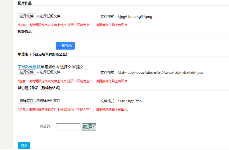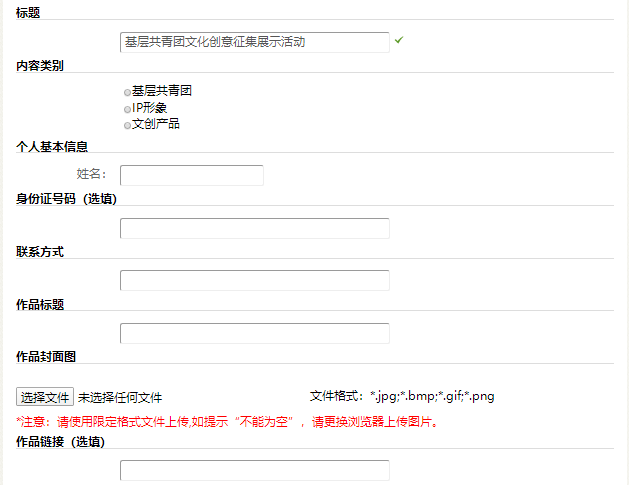 8.按照作品分类选择内容类别,并按照提示填写作品。注:身份证号码为选填项;已发布的作品链接也可上传;由于受限,图片只可上传一张,可选择做成简单视频也可选择压缩格式上传;申报表图片格式不支持上次,请拖到文档里进行转化成相关格式进行上传(如有疑问,联系邢老师:15711151863)。点击【提交】界面如下: