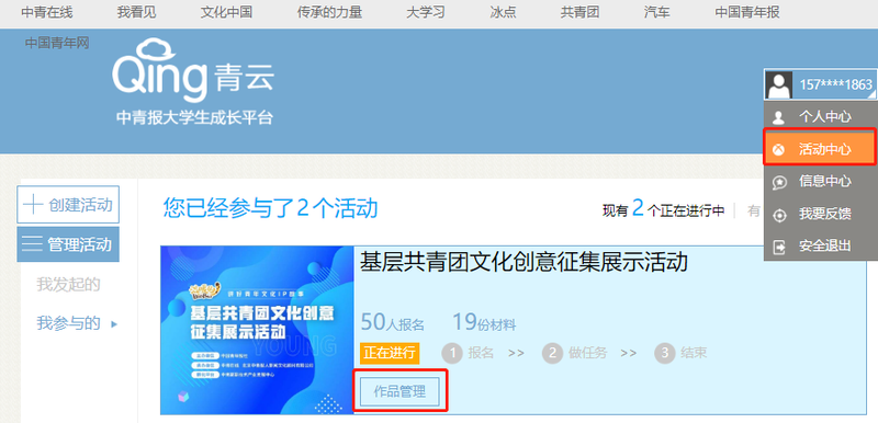 5、报名成功后,上传作品示例如下,登录个人账号,点击【活动中心】,进入以下界面: