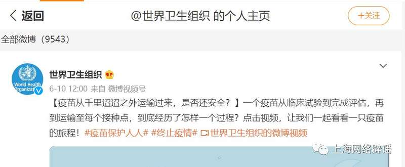 相反,在世卫组织官方微博、微信、官网上,有不少内容强调接种疫苗的重要性。其中,世卫组织官方微博“@世界卫生组织”发布的最新一条消息主题正与疫苗相关——用视频展示了疫苗从临床试验到完成评估,再到运输至每个接种点的过程,并贴上了“#疫苗保护人人#”“#终止疫情#”的标签。