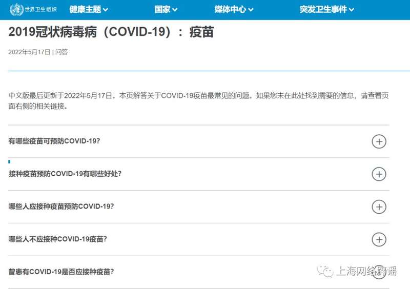 在世卫组织官方微博上,“#疫苗保护人人#”的标签频繁出现。在6月4日我国端午假期,世卫组织还特意发布了一段视频,提醒公众出游时“保持人际距离、戴口罩、注意呼吸道礼仪、勤洗手、多通风、打疫苗……防疫措施不要忘”。在世卫组织官网上,提倡接种疫苗的内容更加丰富,并设有“关于COVID-19和相关健康主题”的问答,详细介绍了哪些疫苗可以预防新冠肺炎、接种疫苗有哪些好处、接种疫苗的注意事项等。