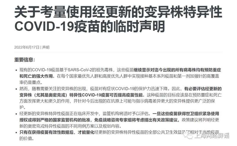 《关于当前COVID-19疫苗成分的临时声明》也指出:使用目前已获得许可的疫苗进行COVID-19疫苗接种的主要目标仍然是减少住院、重症和死亡,并保护卫生系统。使用目前已获得许可的基于指示病毒(即从2019年12月首批COVID-19病例中确认的病毒)的疫苗可提供高水平保护,防止所有变异株(包括通过加强剂防止奥密克戎)的重症结果。”