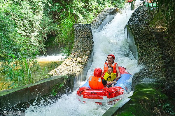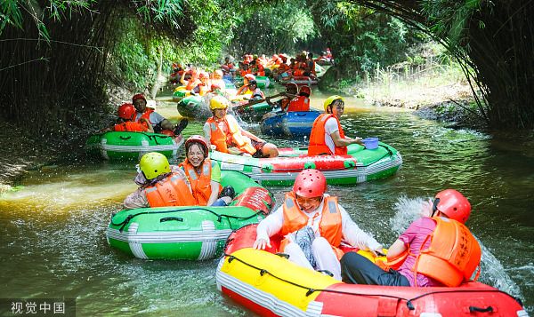 2022年7月16日,江西吉安,在持续的高温天气催热下,新干县海木源漂流迎来旺季,来自各地的游客纷纷来此尽享4.5公里长的竹林漂流的清凉,休闲避暑度夏。