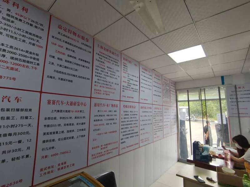 听闻记者说阳过,坐在前台正低头刷手机的“通答劳务”工作人员头都没抬地回应:“不太好找”,“大多数企业现阶段不接受”。记者软磨硬泡,对方想起来有一家企业不介意求职者进过方舱,“日立洗衣机,流水线上站着上班,你能接受吗?”记者连连点头,“先加个微信,过两天他们要人了我通知你。”接下来几家劳务中介则索性直接回绝。“诚实劳务”的工作人员直言不讳,指出记者这种情况几乎没有岗位会要;“徽鹏劳务”更是声称,最近疫情反复,企业要求更加严格、把关更紧,“不接受有阳性史”……但记者转了一圈,还是问到了数个能接受新冠肺炎康复人员的工作。除了上述“日立洗衣机”外,“夏普电器”的流水线工人岗位和“极兔快递”的分拣岗位都不限制康复人员。此外,一些场所的保安岗位也不设限,中介称可以安排记者去面试。