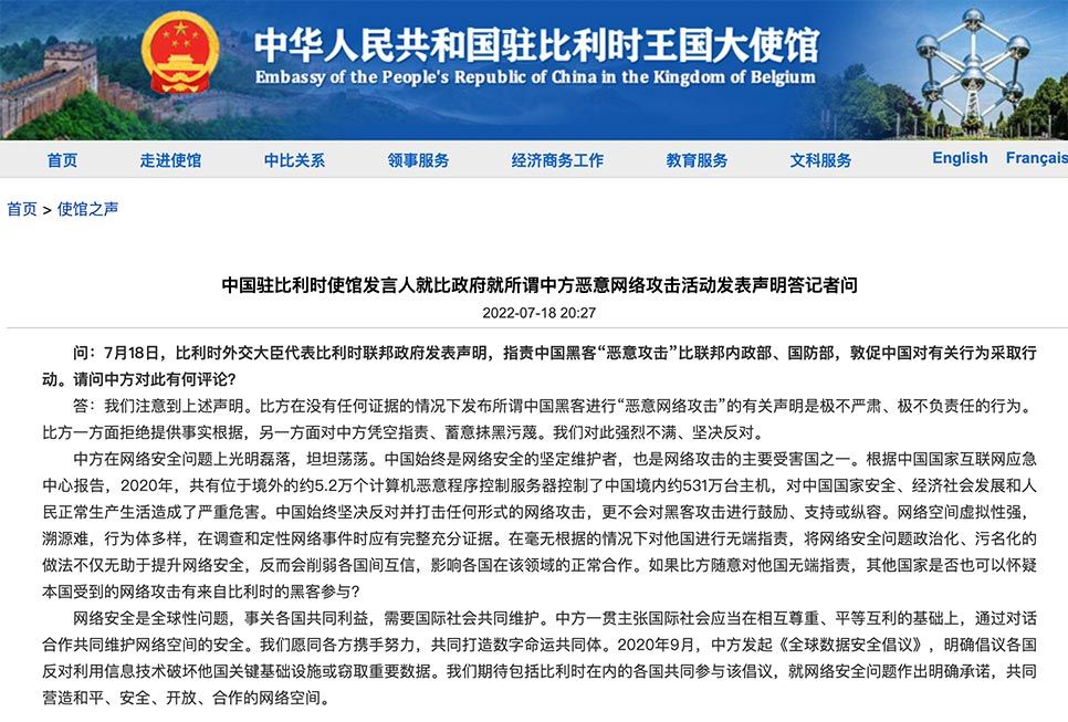 原题为《中国驻比利时使馆发言人就比政府就所谓中方恶意网络攻击活动发表声明答记者问》