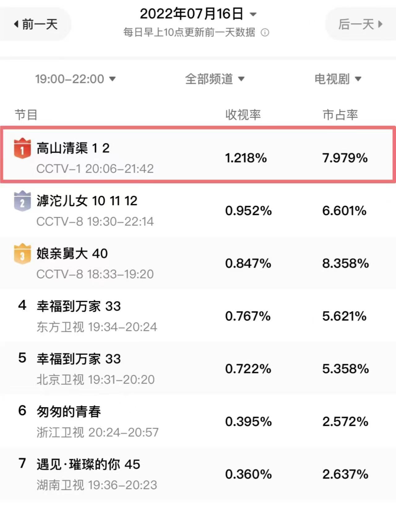 以“七一勋章”获得者黄大发为原型创作的电视剧《高山清渠》,7月16日起在央视一套黄金档播出。电视剧开播不久,直播关注度和市占率迅速登上榜首。黄大发本人也称赞电视剧拍得好,“看到这个电视剧,就想到当初我们为什么要修渠。”