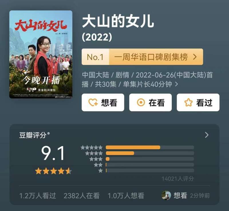 《大山的女儿》6月26日在CCTV-1黄金时段开播之后,收视连续破1,18岁至30岁年轻观众占比达37.96%。不少观众把它称作《山海情》后,又一部值得追的脱贫题材剧,“越看越有味,每集都会看哭”。