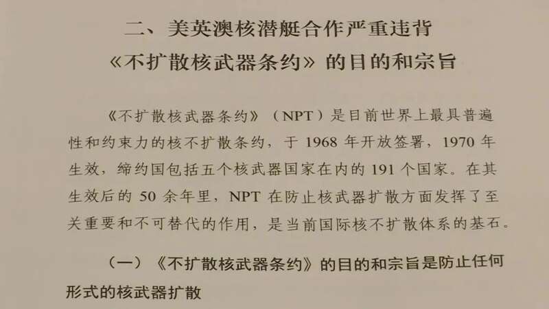 针对这份研究报告,在20日召开的外交部例行记者会上,外交部发言人汪文斌表示:报告通过翔实的数据和材料,深入揭露了三国核潜艇合作严重违反《不扩散核武器条约》的目的和宗旨,直接违反《国际原子能机构规约》,挑战国际原子能机构保障监督体系,破坏全球战略稳定,冲击国际核不扩散体系,加剧军备竞赛,损害无核武器区条约,危害亚太地区和平稳定。这再次证明国际社会对美英澳核潜艇合作的担忧有理有据。