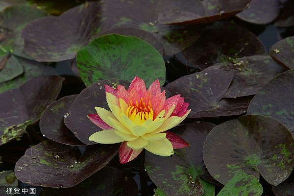 2022年7月22日,北京,圆明园荷花基地现珍稀双色睡莲万维莎。
