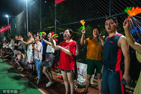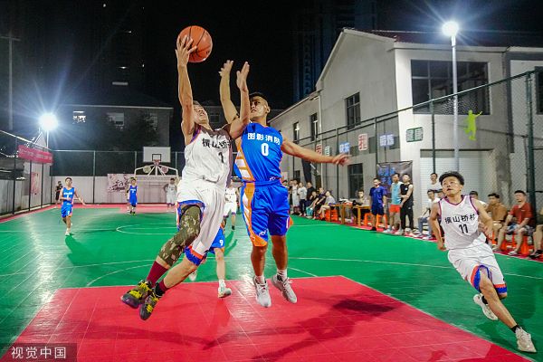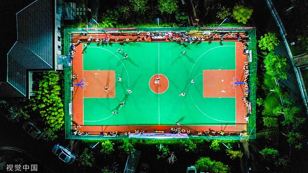 2022年7月22日晚,浙江湖州,长兴县太湖图影山湖花园社区灯光篮球场内,当地两支乡村篮球队正在进行火热比拼,球员在球场上挥汗如雨,享受运动带来的快乐。