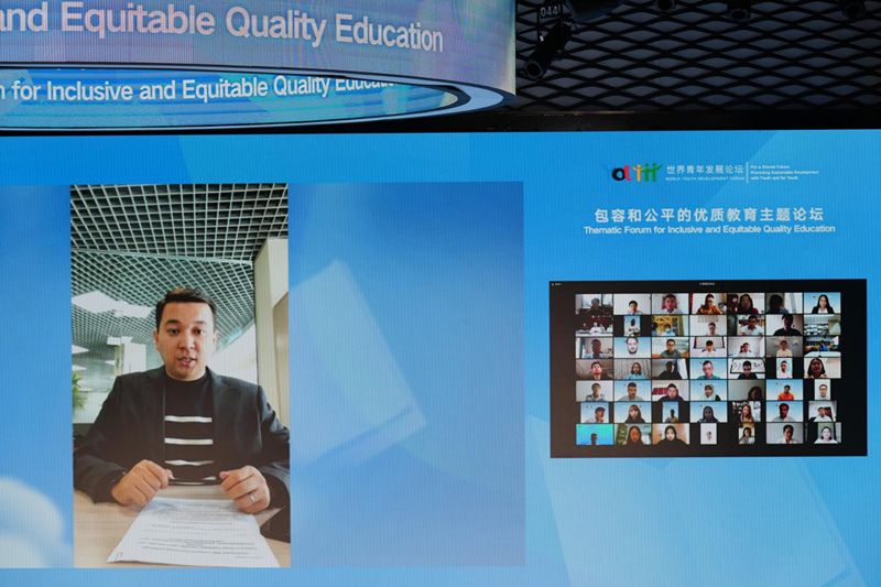 7月23日,在世界青年发展论坛“包容和公平的优质教育”主题论坛上,哈萨克斯坦“阿玛纳特”党青年团主席努尔然•热特皮斯巴耶夫远程视频连线致辞。中青报·中青网记者李隽辉/摄