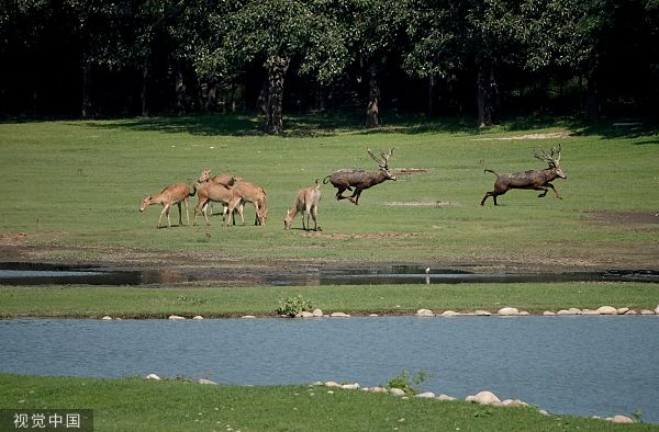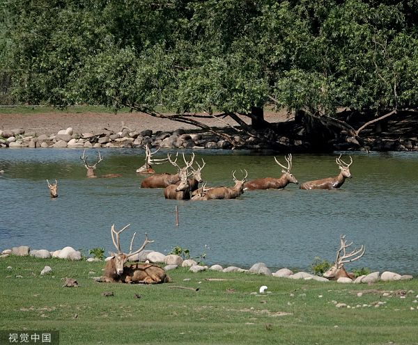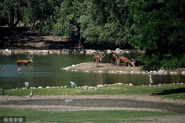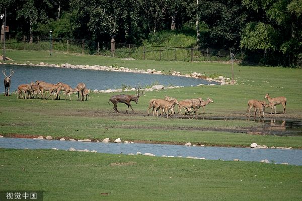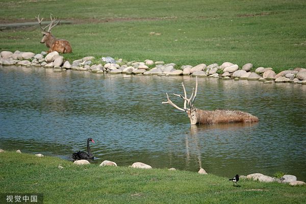 2022年7月23日,北京,大暑时节,麋鹿苑里的麋鹿们在保护区里悠然自得的地生活着。