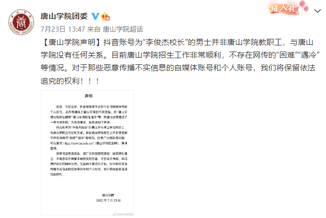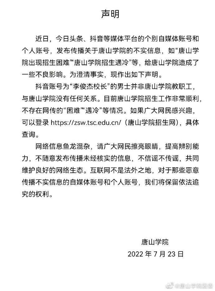 7月23日,共青团唐山学院委员会官方微博刊发学院声明称,目前唐山学院招生工作非常顺利,不存在网传的“困难”“遇冷”等情况。这份声明提及,近日,今日头条、抖音等媒体平台的个别自媒体账号和个人账号,发布传播关于唐山学院的不实信息,如“唐山学院出现招生困难”“唐山学院招生遇冷”等,给唐山学院造成了一些不良影响。学院方面还表示,抖音账号为“李俊杰校长”的男士并非唐山学院教职工,与唐山学院没有任何关系。