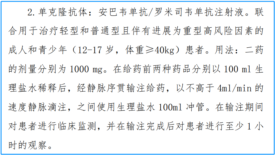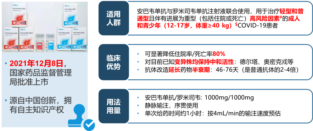 安巴韦单抗和罗米司韦单抗联合疗法于2021年12月8日获得国家药品监督管理局(NMPA)上市批准,用于治疗轻型和普通型且伴有进展为重型(包括住院或死亡)高风险因素的成人和青少年(12-17岁,体重≥40 kg)新型冠状病毒感染(COVID-19)患者。其中青少年适应症人群为附条件批准。国家卫健委于2022年3月15日已将该药纳入《新型冠状病毒肺炎诊疗方案(试行第九版)》,用于抗新冠病毒肺炎的治疗。