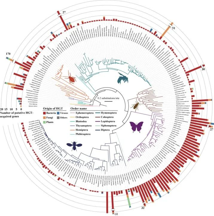 本研究共鉴定获得1410个外源的水平转移基因,许多都是首次报道。平均而言,鳞翅目(如小菜蛾、黑脉金斑蝶等)获得16个HGT基因/物种,半翅目(如褐飞虱等)获得13个HGT基因/物种,鞘翅目(如赤拟谷盗等)获得6个HGT基因/物种,膜翅目(如西方蜜蜂等)获得3个HGT基因/物种。从HGT基因来源来说,79%的HGT基因是从细菌中获得,13.8%是从真菌中获得,2.6%是从病毒中获得,3%是从植物中获得,剩下1.6%的来源未知。