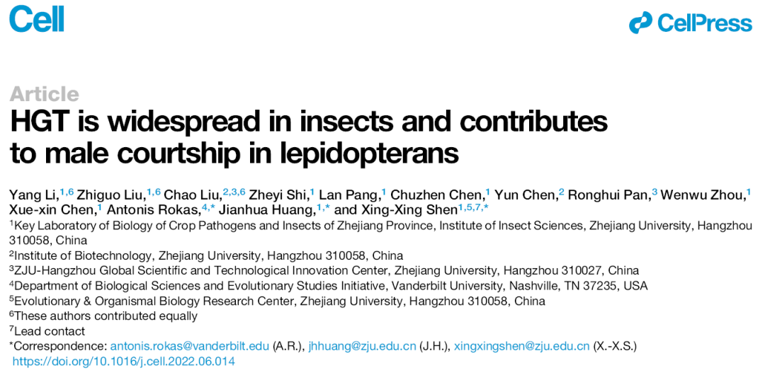 这项研究于北京时间7月18日,刊登在国际顶级期刊《细胞》上,浙江大学农业与生物技术学院研究生李杨、刘志国、刘超为共同第一作者,浙江大学农业与生物技术学院沈星星研究员、黄健华研究员、范德堡大学Antonis Rokas教授为共同通讯作者,陈学新教授给予大力支持和帮助,陈云教授、潘荣辉研究员、周文武研究员等也参与本研究。