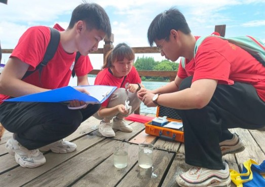 建筑工程学院“爱水护源”实践队员在检测雨山湖水质的浊度。校团委供图。