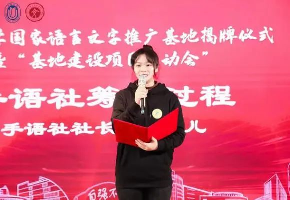 图为唐雪儿作为社长介绍手语社筹备过程
