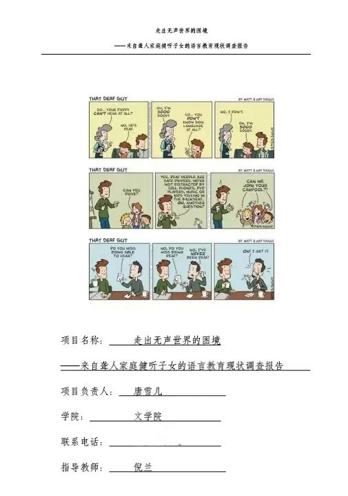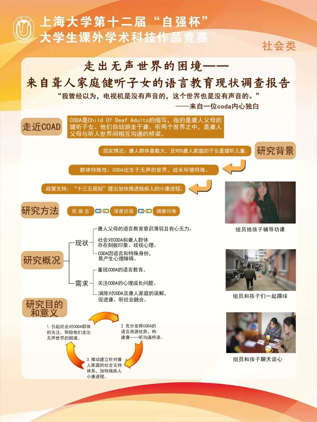 一次偶然经过徐汇区业余大学,唐雪儿看到了无声的欢笑,也是她对于那个无声世界的第一次邂逅。进入大学后,她参与了国家语言文字推广基地负责人倪兰老师指导的《走出无声世界的困境——来自聋人家庭健听子女语言教育现状调查报告》项目。她长期走访位于静安区的一个聋人家庭,了解成年CODA(聋人父母的健听子女)并进行深度访谈,以获得更真实的一手资料。该项目获得了2019年中国“互联网+”大学生创新创业大赛上海大学三等奖。