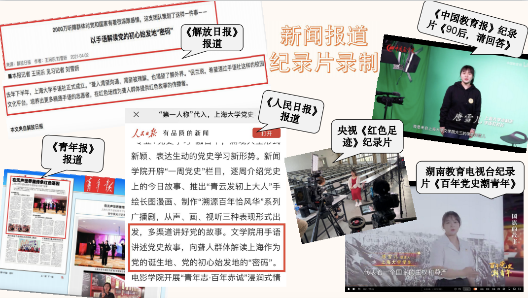 “用手语讲述故事是什么体验?”“无他,唯手熟尔。”唐雪儿这样回答记者。作为上海大学手语社代表,她还接受了《青年报》《解放日报》的采访,参与拍摄《中国教育报》制作的《90后,请回答》、湖南教育电视台制作的《百年党史“潮”青年》等多家媒体的纪录片,还参与拍摄央视建党百年纪录片《红色足迹》。
