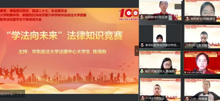 7月9日上午,校团委联合华东政法大学附属中学、新疆克拉玛依市第六中学开展了“提升法治素养,增强责任意识,喜迎二十大,永远跟党走”线上普法教育活动。华政法援的志愿者,在线为两校中学生主持法律知识竞赛、讲授精彩法治微课,助力青少年法治教育。