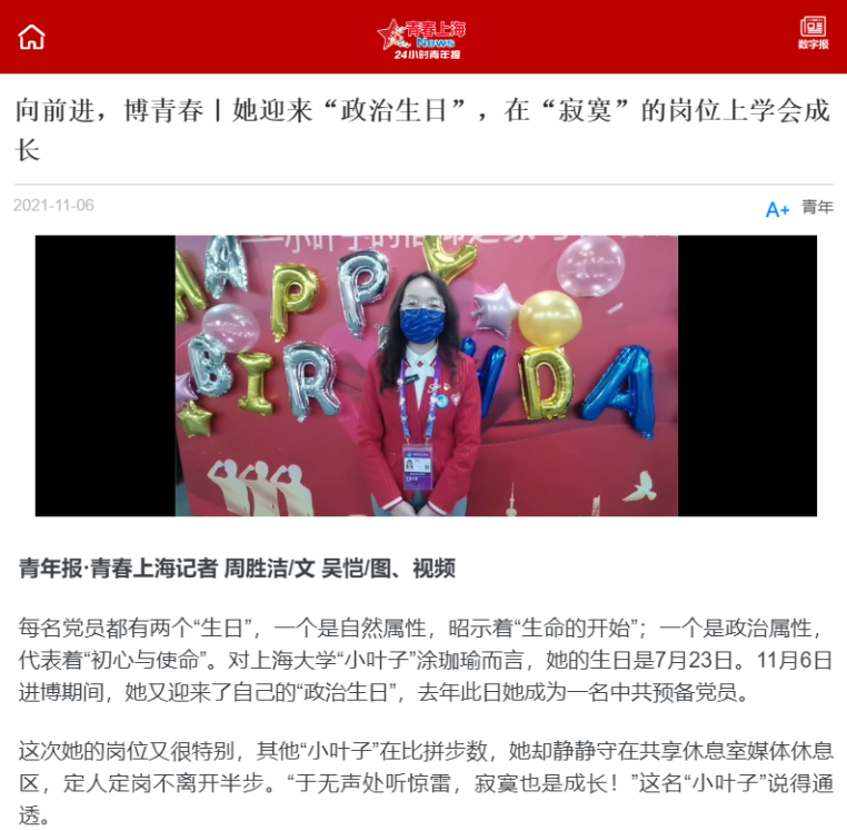 作为一名政治生日在进博会期间的小叶子和上大志愿者队伍党团活动的策划人,她也更加鲜明地认识到,作为党员一定要有“功成不必在我”的精神境界和“功成必定有我”的担当。 每个党员都应当成为一束光,无论是照亮身旁,还是照亮更多的地方。 她在无私奉献的志愿服务中,践行和感悟自己身上的使命和担当。其个人事迹也被《中国青年报》《文汇报》等多家主流媒体报道。