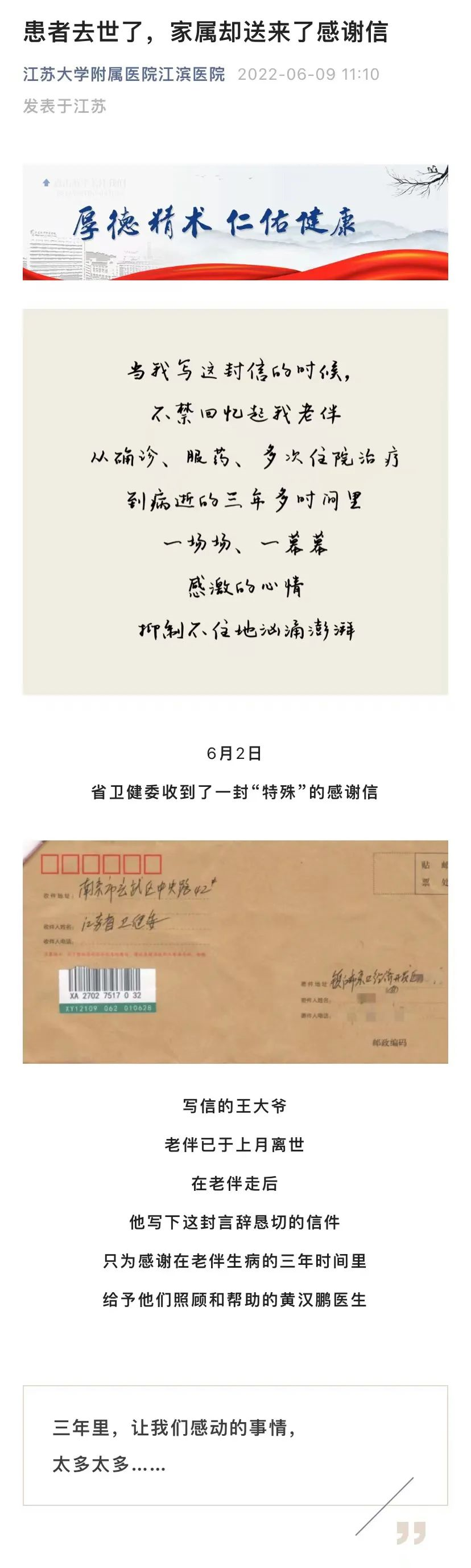 该篇文章获得阅读量排行TOP1。江苏大学附属江滨医院黄汉鹏医生及其医疗团队三年里对王大爷的老伴尽职尽责、全心全意救治,赢得了王大爷一家的信任和理解,这正是医患关系最美的样子。