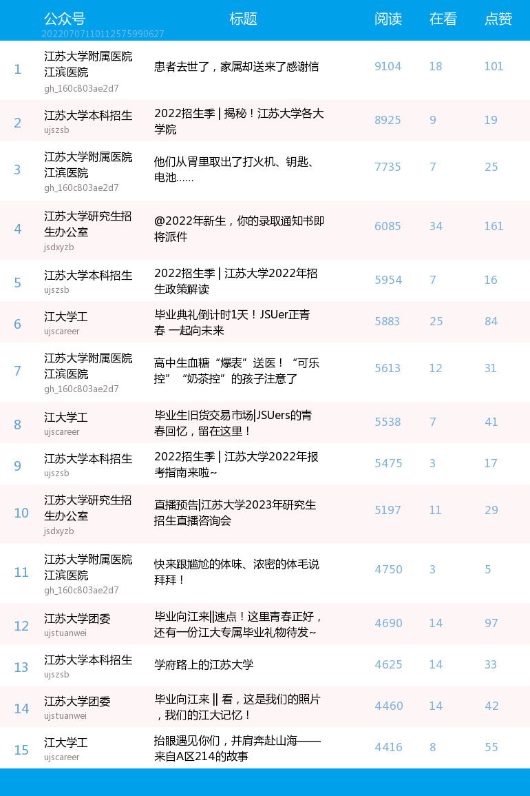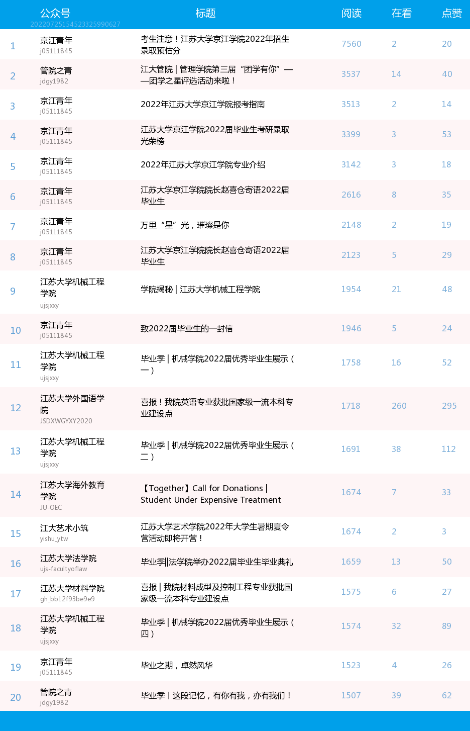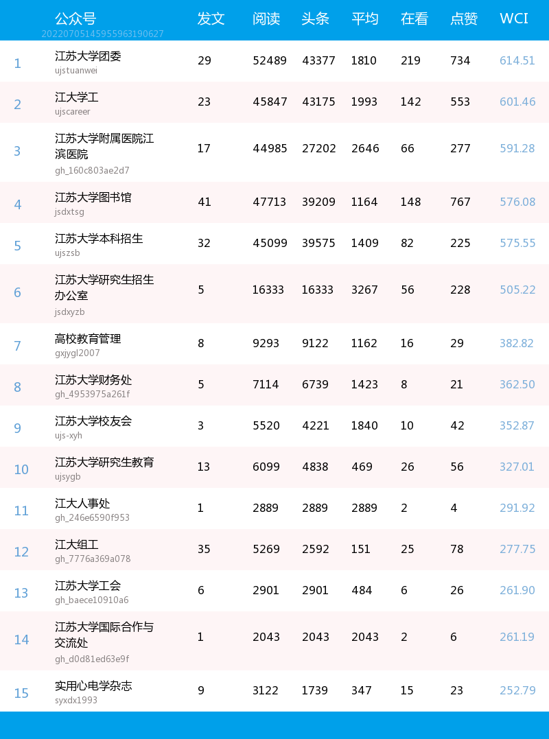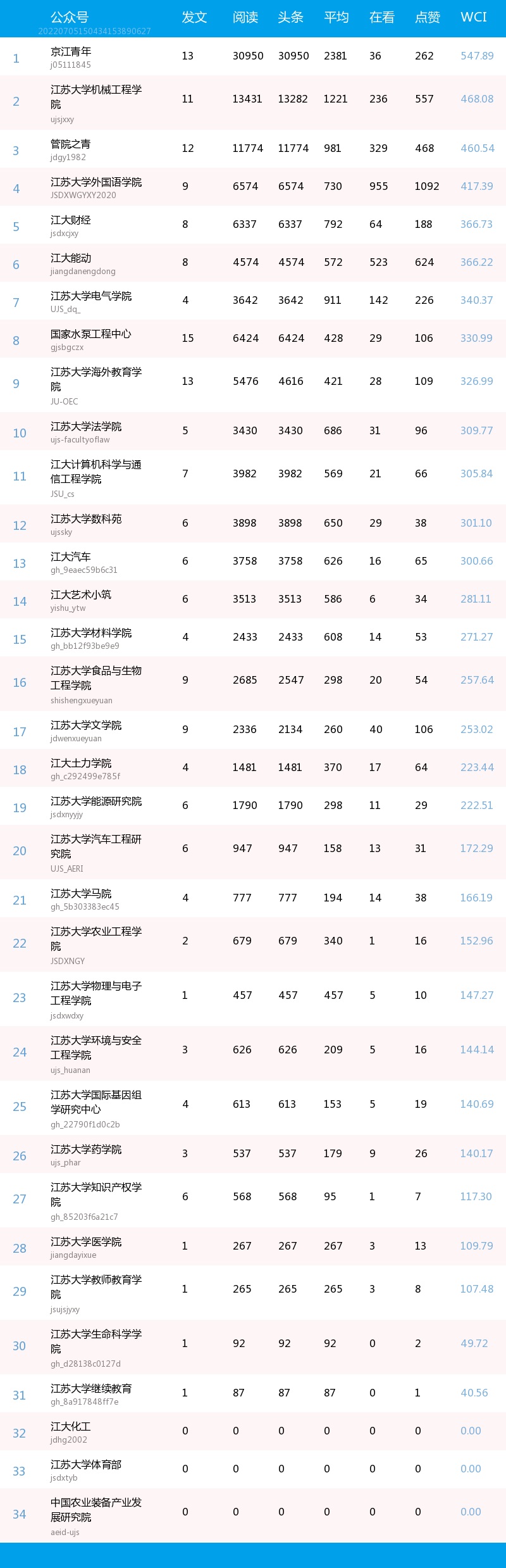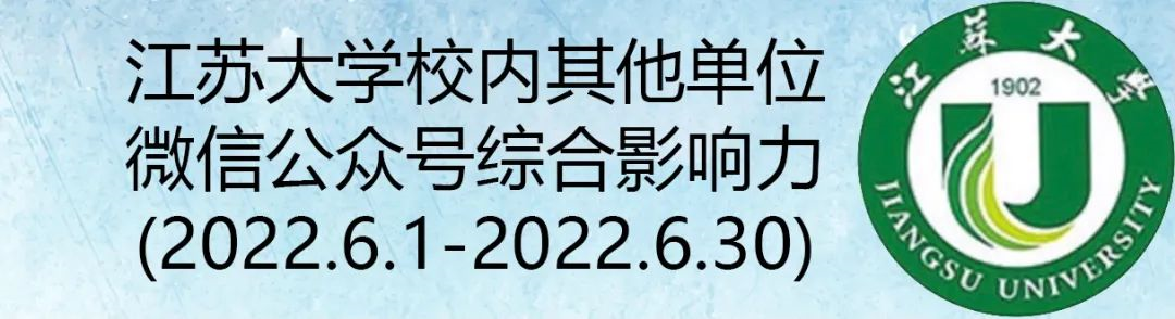 为推进校内新媒体联盟联动,形成校园新媒体宣传合力,江苏大学官方微信每月发布校园新媒体微信公众号排行榜。榜单收录各教学科研单位及其他单位微信公众号,同时将各微信公众号综合影响力和文章阅读量排名列出,供大家相互学习,共同进步。