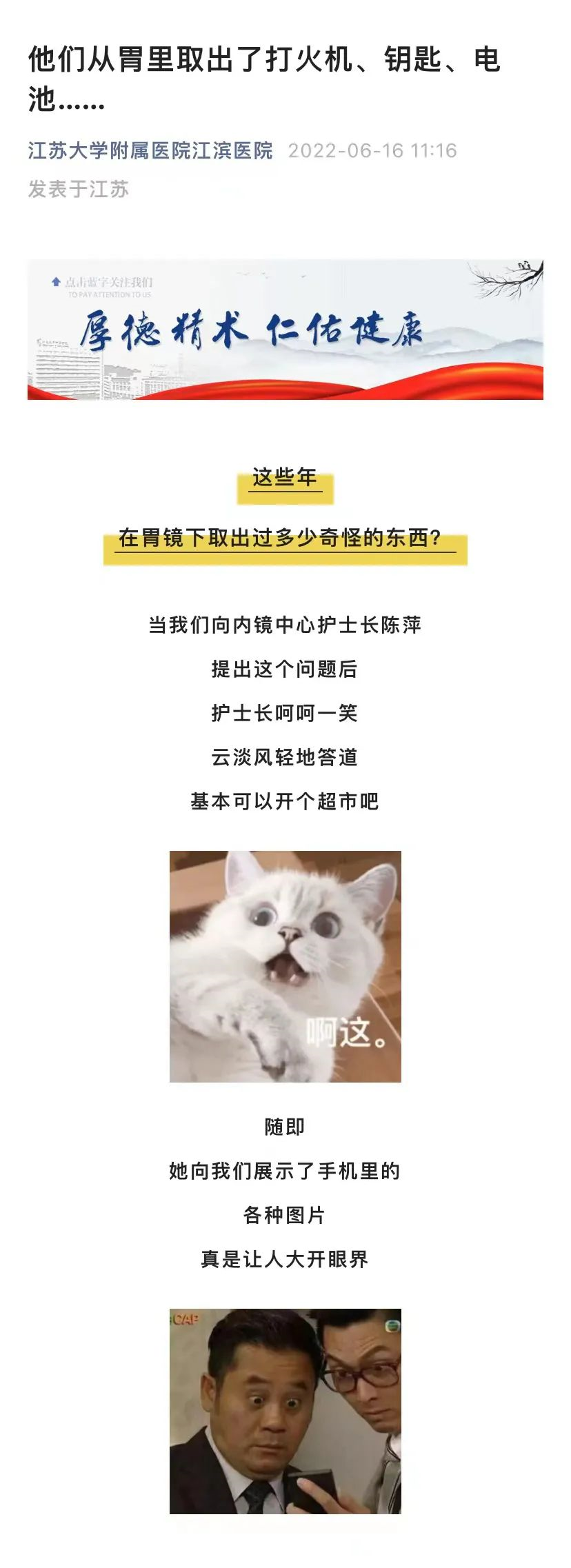 该篇文章获得阅读量排行TOP3。推文通过俏皮的语气和恰到好处的表情包,把日常检查中发现的异物进行了展示,既展现了江滨医院消化内科的实力,也提醒广大市民要多加注意。